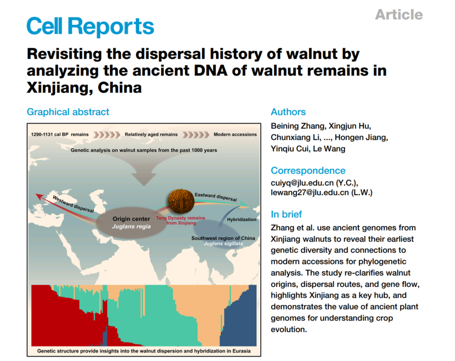 崔银秋教授与植物科学学院王乐副教授团队利用古DNA技术成功获取了世界首例古代核桃全基因组数据,并综合运用古基因组学与群体遗传学分析手段系统揭示了核桃(Juglans regia)在丝绸之路上的传播路径及遗传演化特征。该研究不仅填补了核桃古基因组数据的空白,更为揭示丝绸之路上关键经济作物的传播历史与驯化轨迹提供了直接的分子证据。该研究成果以“Revisiting the dispersal history of walnut by analyzing the ancient DNA of walnut remains in Xinjiang,China”为题,在国际权威学术期刊《Cell Reports》上发表。欧洲杯