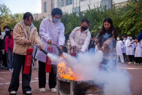 10时整,“火警信号”发出,各楼层迅速组织师生进行疏散,并按照预案进行火灾报警、人员疏散自救、抢救伤员、扑救初级火灾,全体师生在应急疏散中积极配合,听从指挥;各岗位人员各司其职、各尽其责、分工明确、有序地完成了疏散活动。在灭火演练过程中,保卫处消防科科长董立明详细介绍了消防自救面罩、各种类型灭火器和灭火毯的使用方法及注意事项,参与师生均能够遵守操作规程正确实施演练活动。